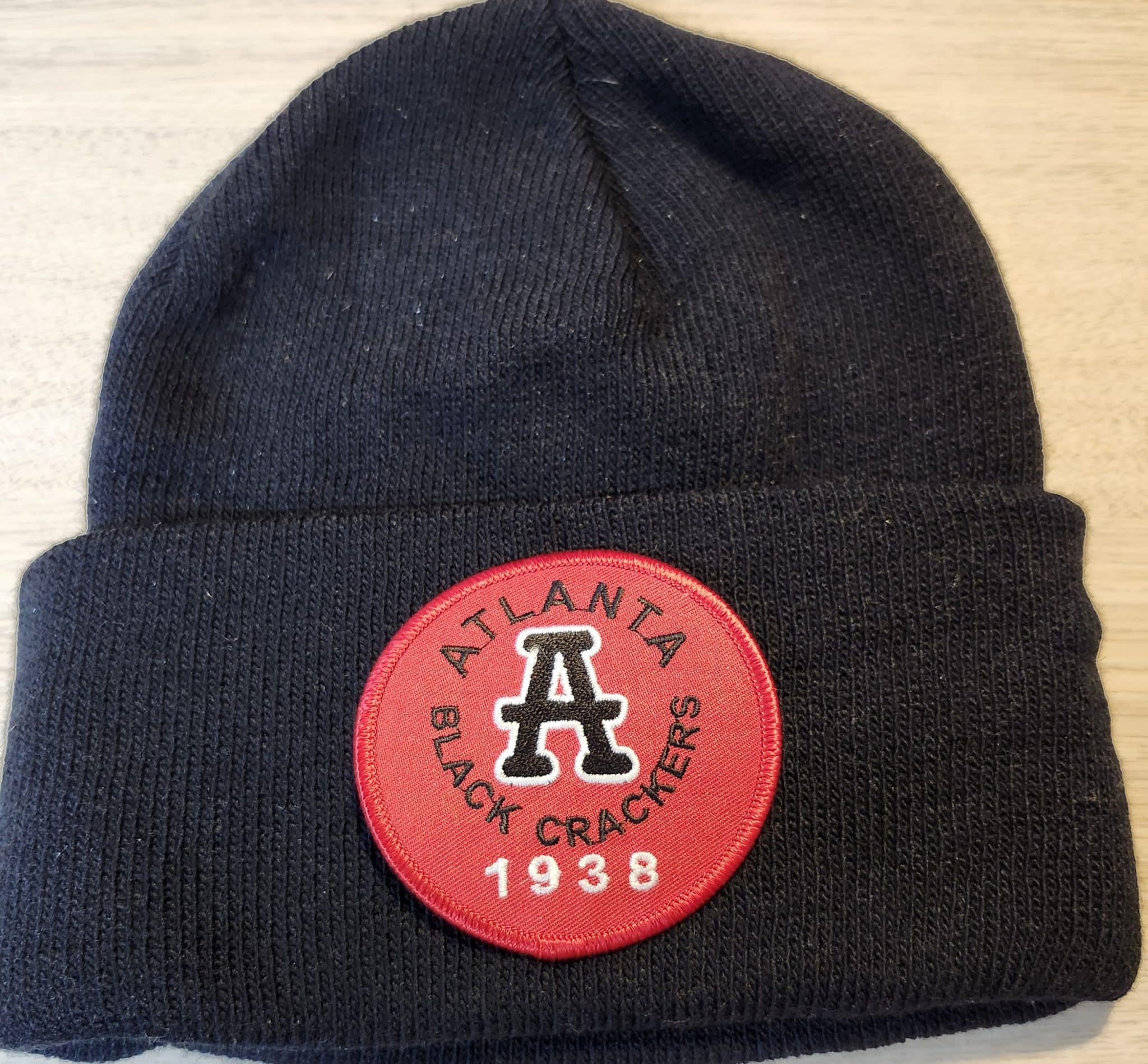 Black Tobaggan Knit caps with asst color 3 inch emblems on front.