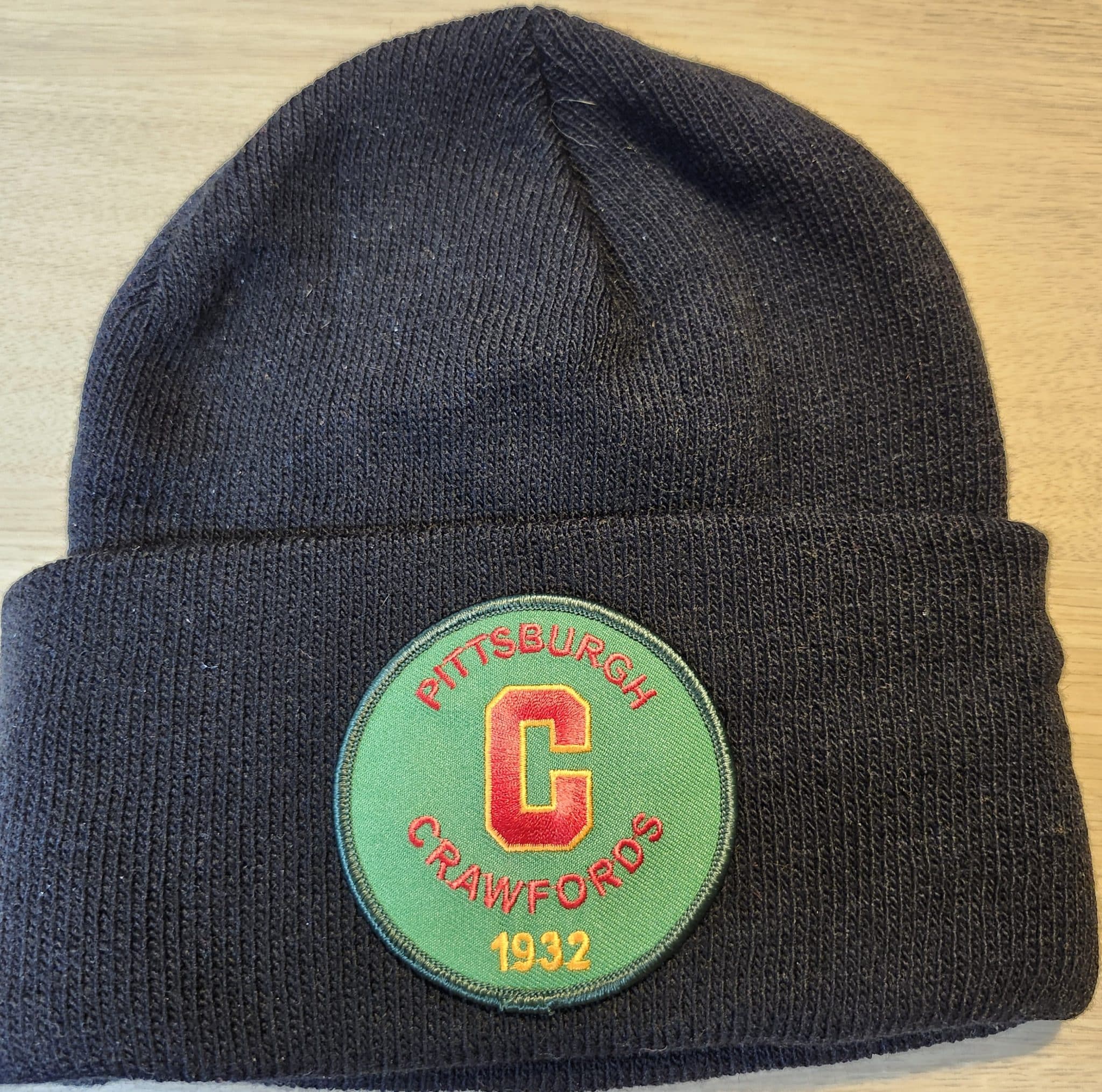 Black Tobaggan Knit caps with asst color 3 inch emblems on front.